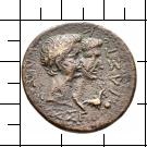 KAIΣ[AΡO]Σ ΣE-BAΣTOY. Kopf des Augustus mit Lorbeerkranz n.r. vorn, Büste der Livia mit Mantel n.r. hinten, davor Ziegenbock und Globus.